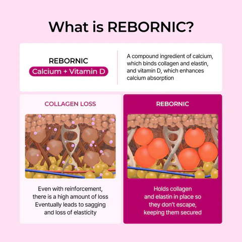 Applying calcium element (almond enzyme active ingredients) influencing the turnover of skin cell, it helps increase skin calcium concentration as a mechanism to extract more calcium active ingredients with Rebornic ingredients.
